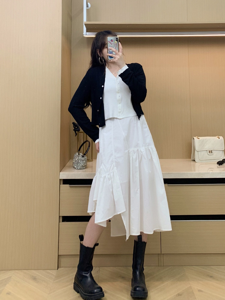 Black Fake Two-Piece Knitted Cardigan Slit Pocket Skirt White Irregular Skirt