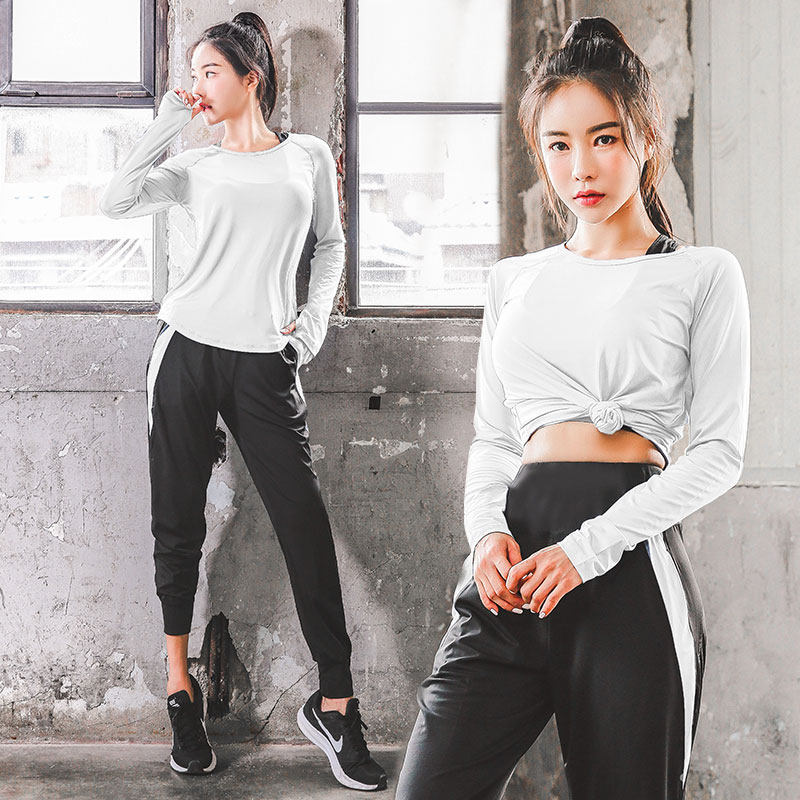 Long-sleeved purple top, black and purple trousers, long-sleeved black top, black and white trousers, long-sleeved brick red top, black and brick red trousers, long-sleeved blue top, black and blue trousers, long-sleeved purple top, vest, and black and purple trousers