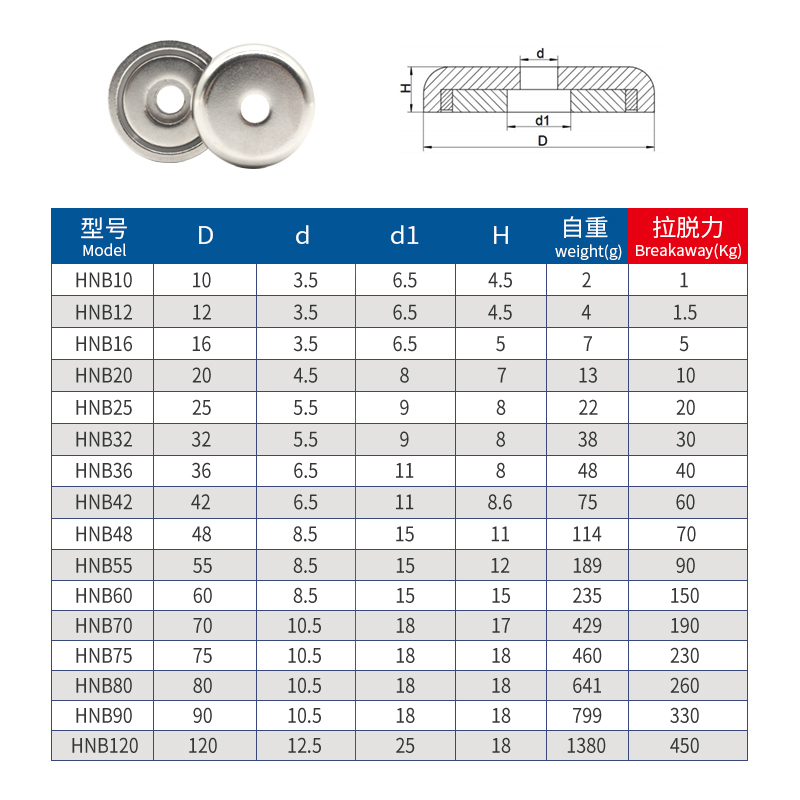 diameter 16mm pull-off force 6kg diameter 20mm pull off force 11kg diameter 25mm pull off force 22kg diameter 32mm pull off force 32kg diameter 36m