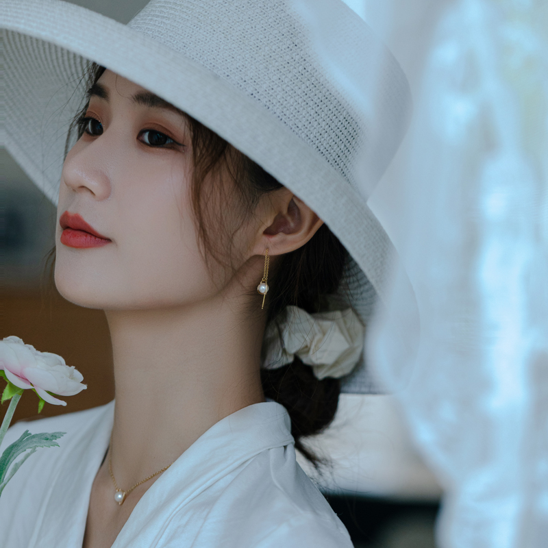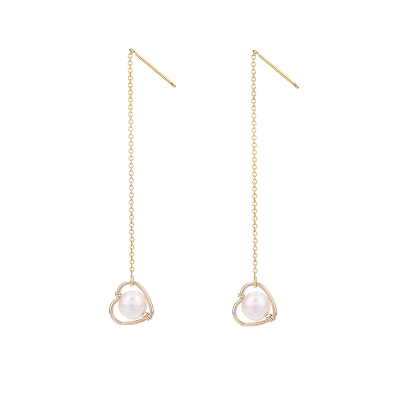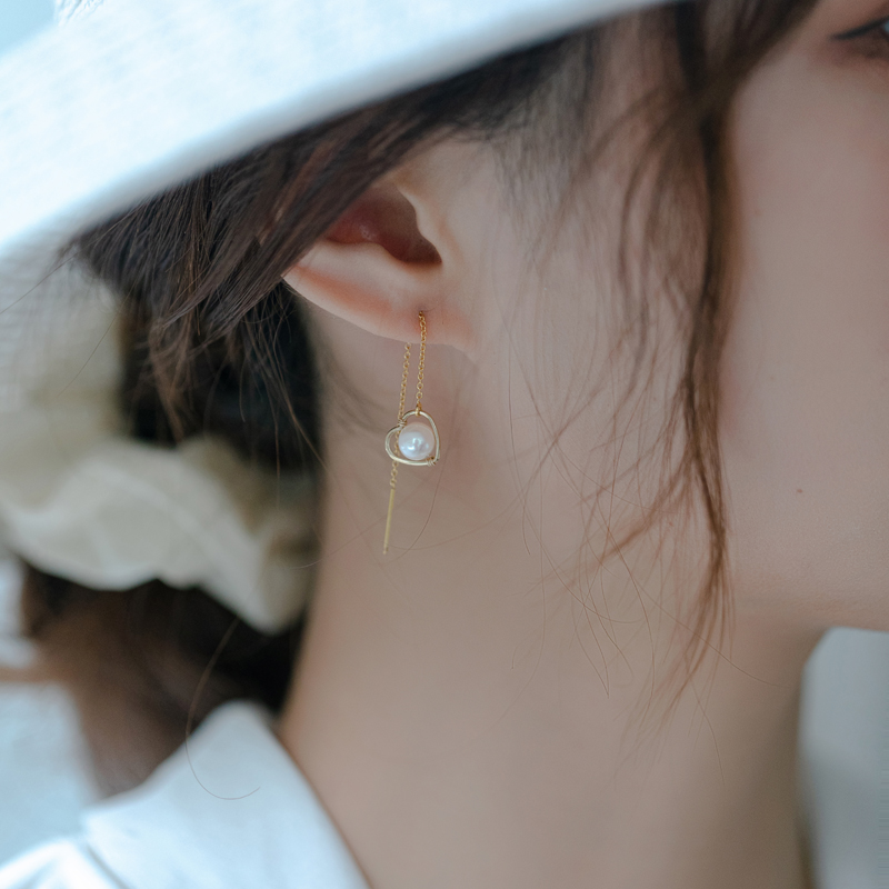 14K bag gold face thin caring pearl ear line temperament stream long simple sweet and beautiful aesthetic winding earring