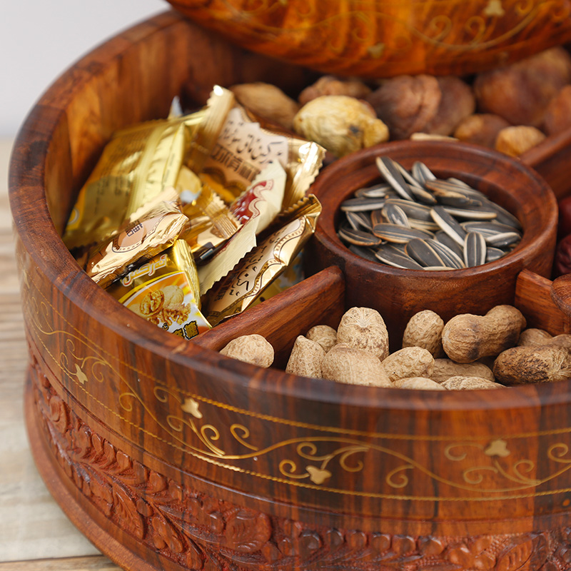 Solid wood dried fruit plate split gold flower with lid candy box retro carved home living room melon seed box wedding snack plate