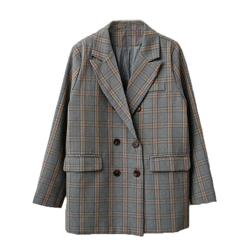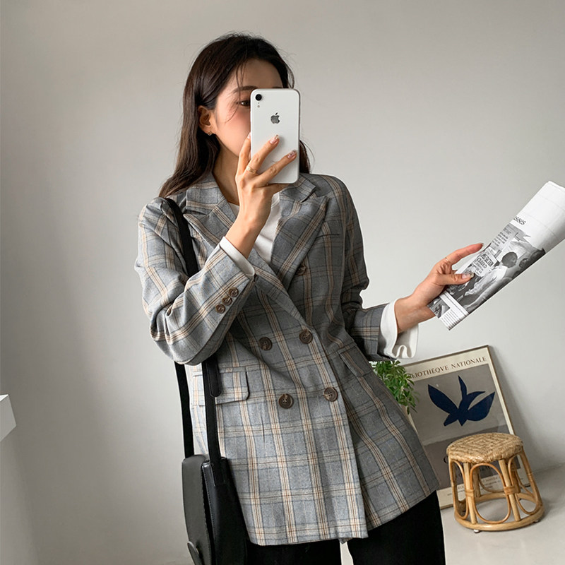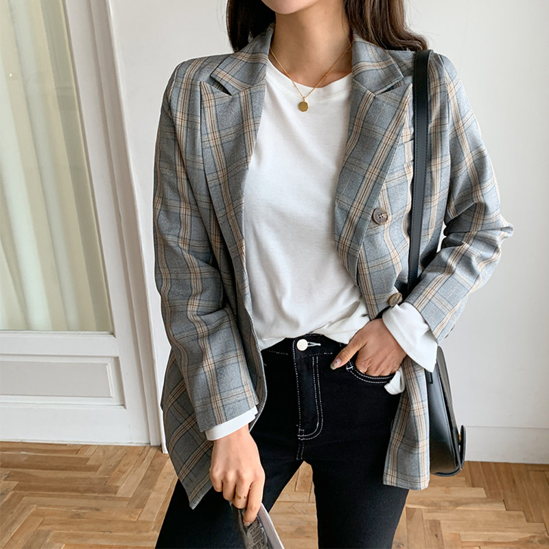 2021 Fall new Inn Wind Grey Grey Plaid Suit Jacket Woman Loose Casual Harbor Taste Thin Western Suit