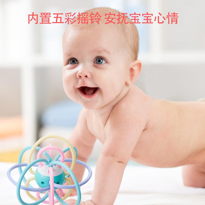 Rattle teether hand grabs the ball