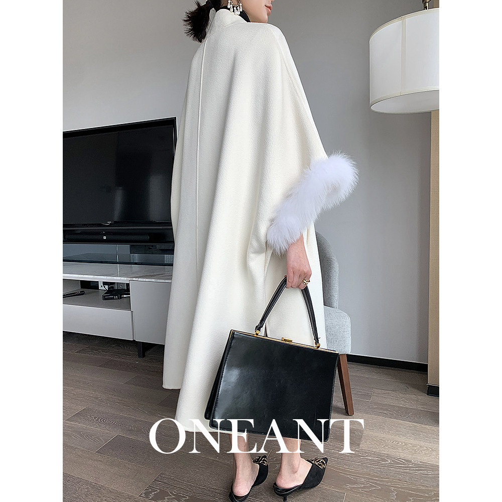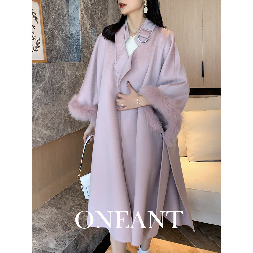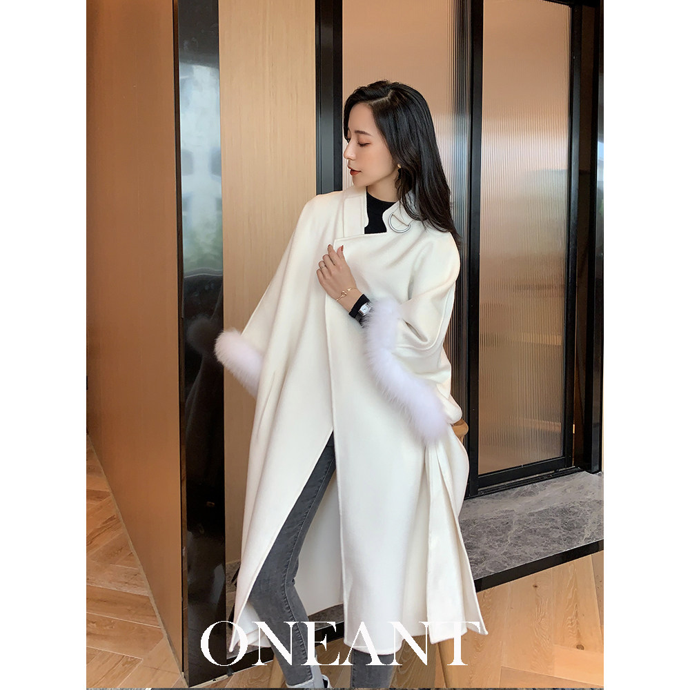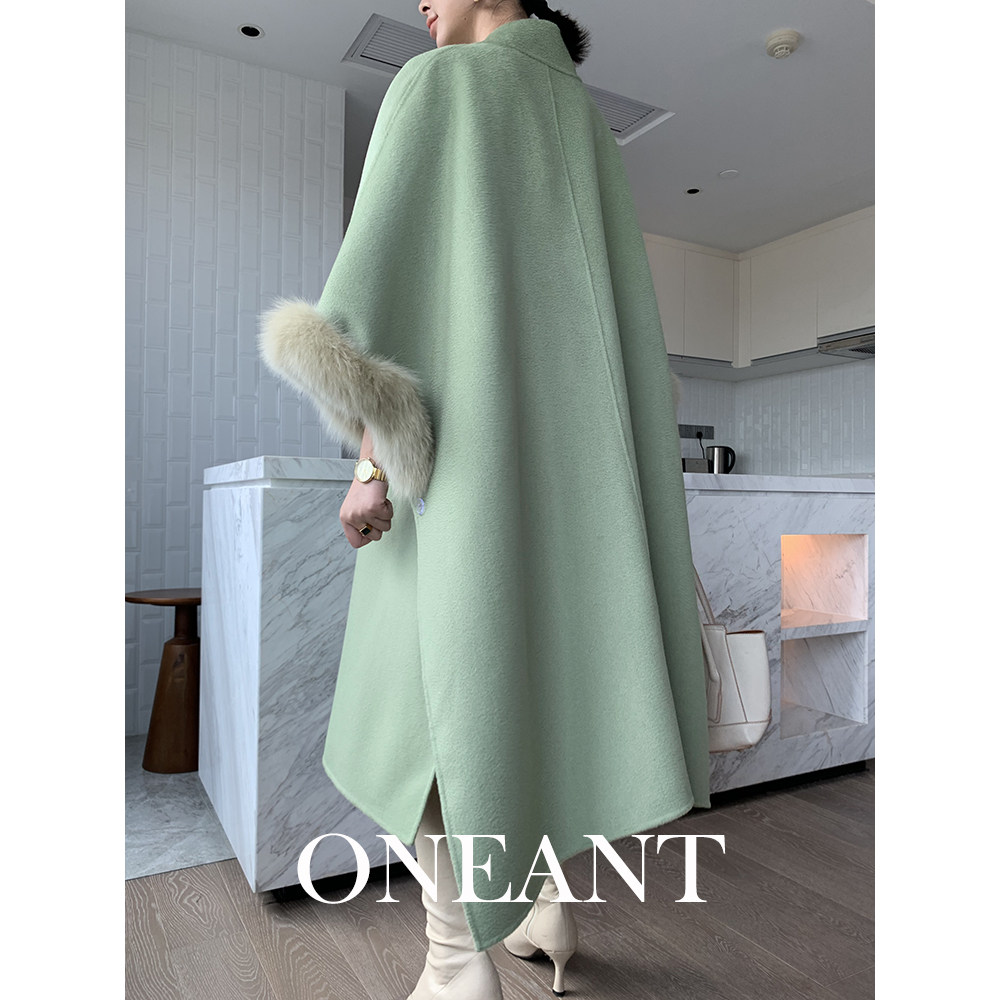 2022 autumn and winter new fox fur collar cloak jacket avocado green water ripple double-sided cashmere woolen coat women