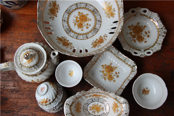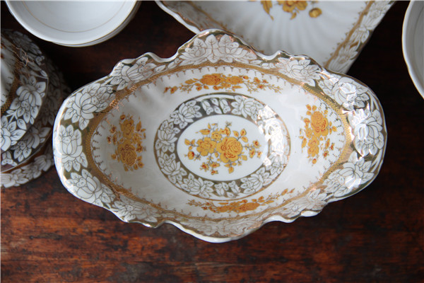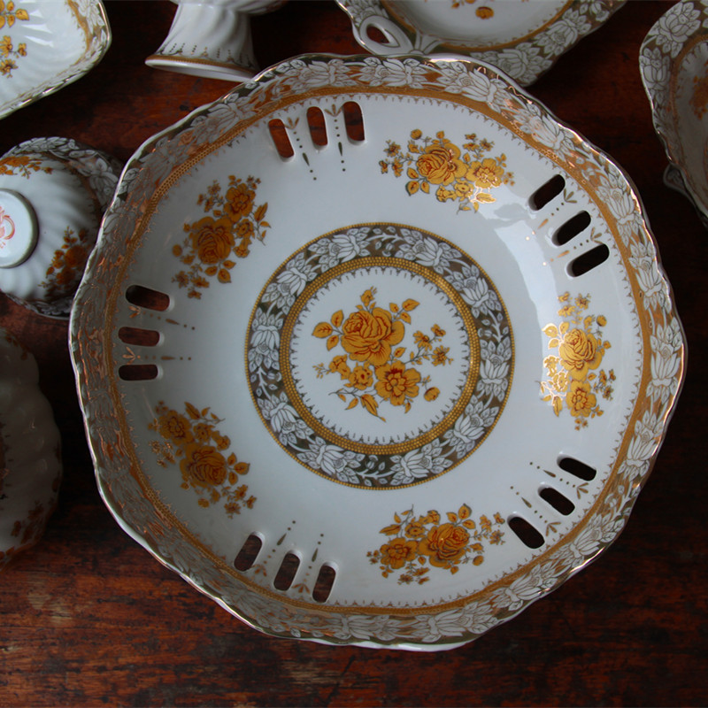 Blemish) Russian old object golden rose ceramic high-legged large fruit basket fruit plate snacks high-legged front cauliflower cup