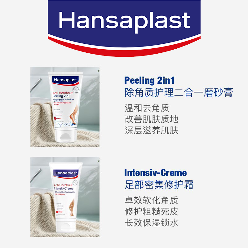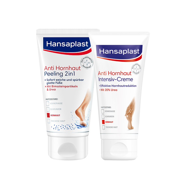 Hansaplast foot care kit in Lunsha, Germany. Repair cream to corneal foot protection cream