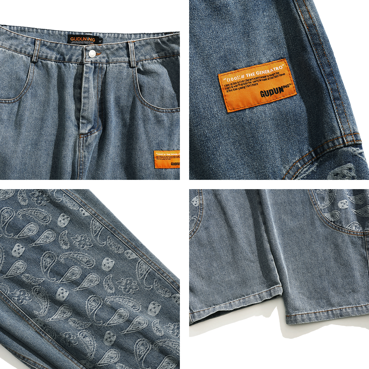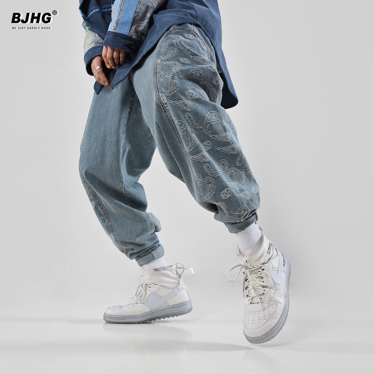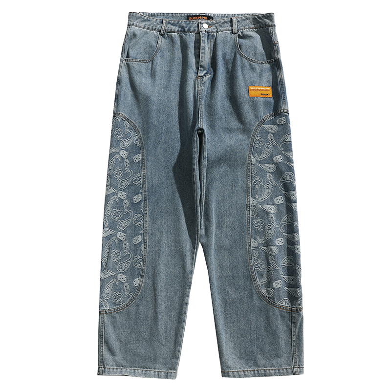Spring new 2022 waist fruit flower jeans Men's national tide Large size loose street INS 100 lap straight cylinder casual pants