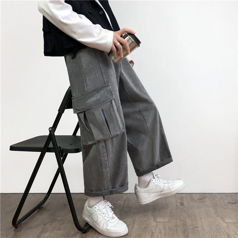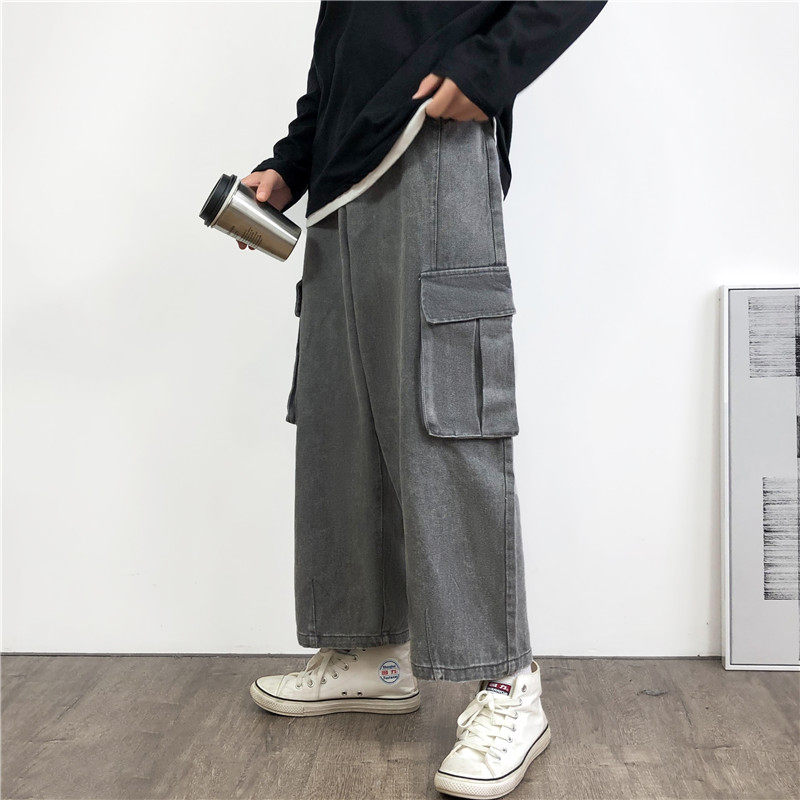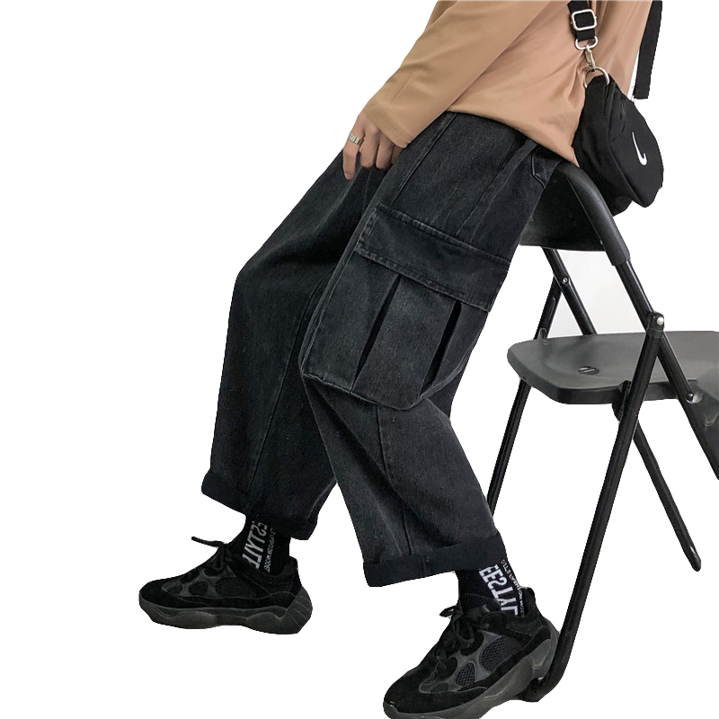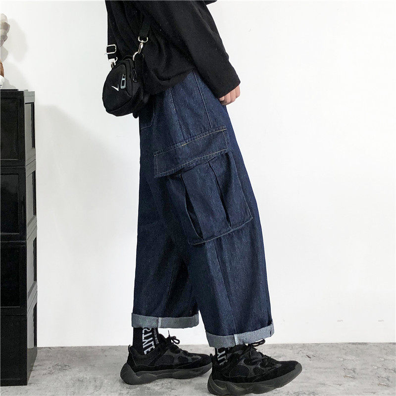 ins Japanese large pocket wide-leg tooling jeans men's tide brand large size loose straight casual pants Korean version of the tide