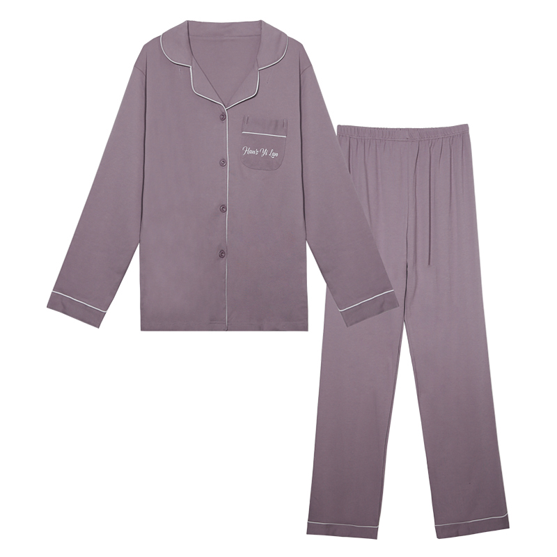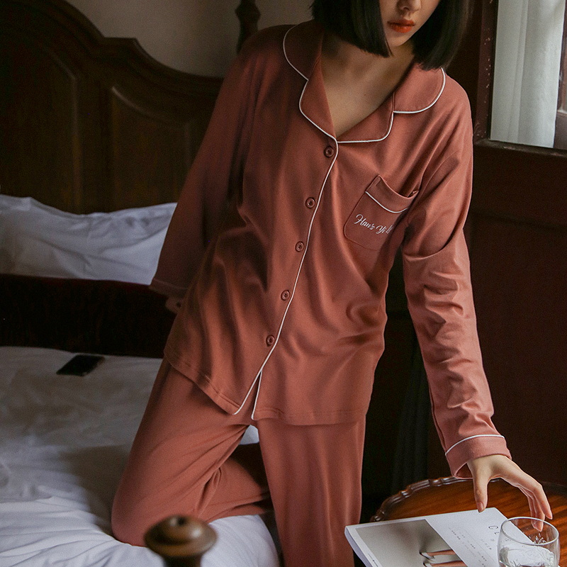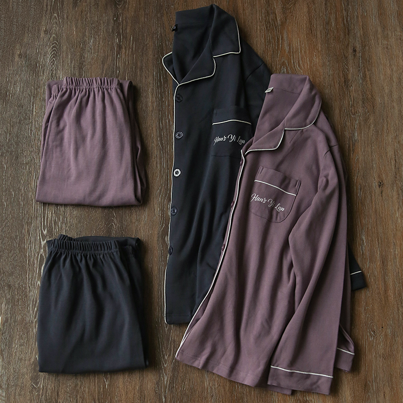 Personal Diary Combed Cotton Simple Lapel Piping Couples Unisex Pajamas Homewear Long Sleeve Pants for Men and Women Spring and Autumn