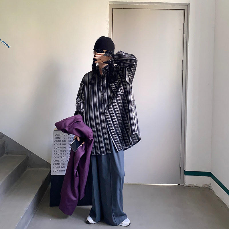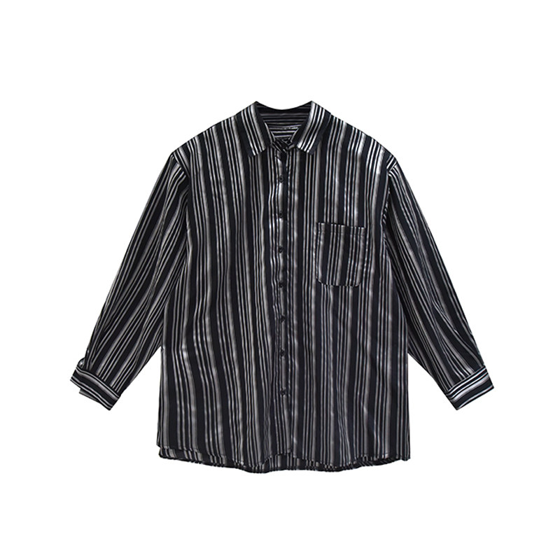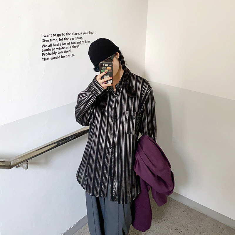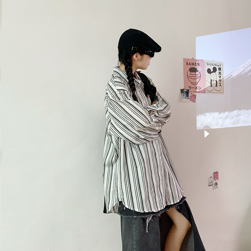 Flower field window vertical striped shirt retro Port wind women's new loose thin medium and long version of the wild shirt spring and autumn tide