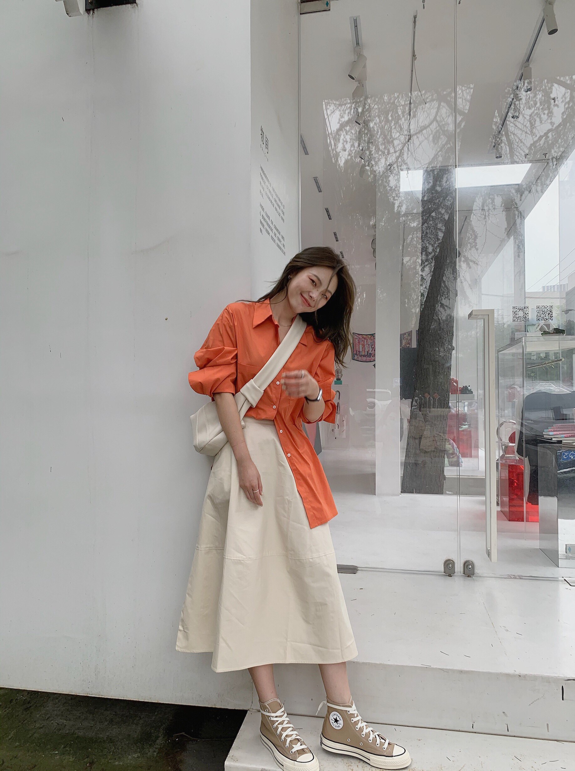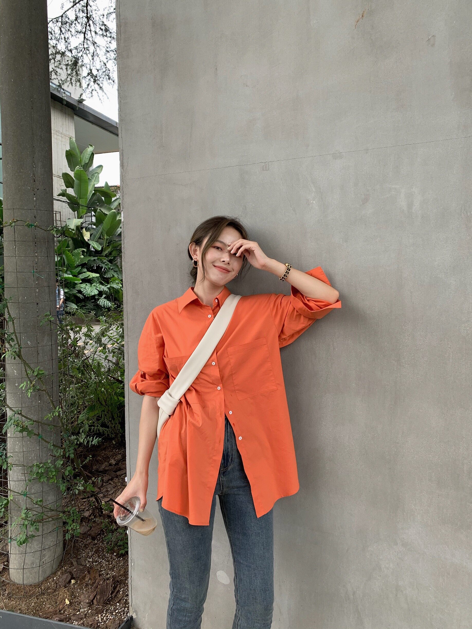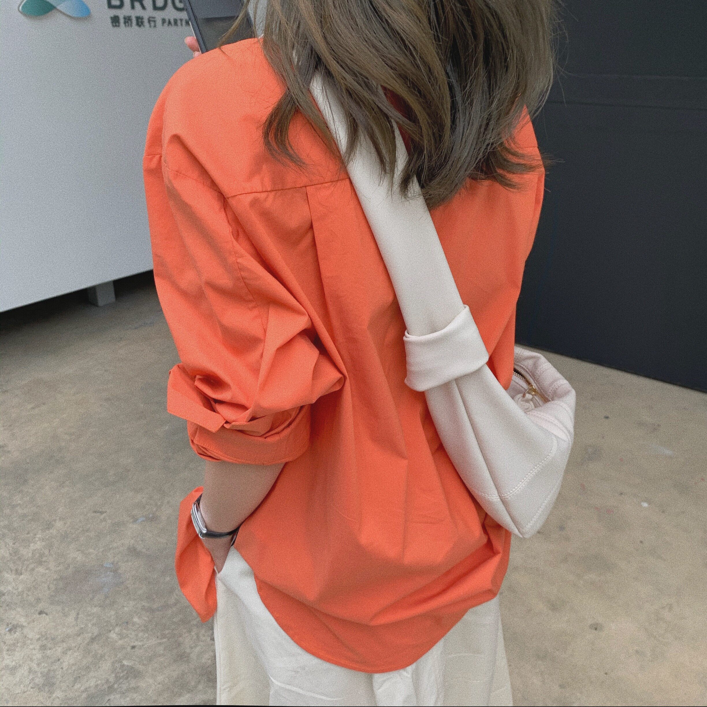 Small pull-out pint bright orange big cuffs Korean version shirt long sleeve flap collar loose blouse women 2022 spring and autumn