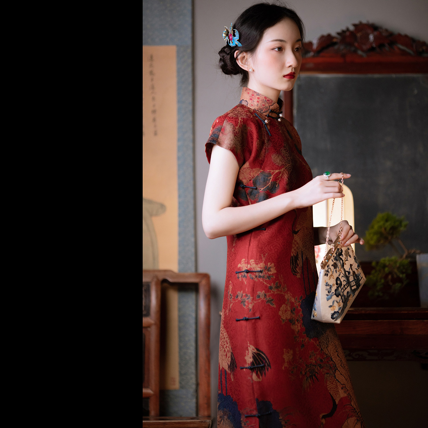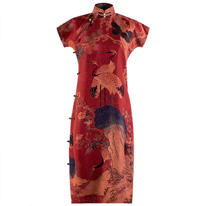 Envy Crane Plot -- Spring Summer Authentic Silk Scents Cloud Yarn Through Holes Rostand Collar Pan Button Short Qipao Chinese Wind Women's Retro Elegance