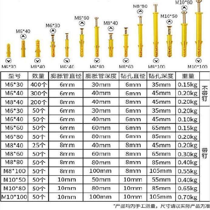 6*30 expansion tubes (with nails) 50 packs 6*40 expansion tubes (with nails) 50 packs 6*60 expansion tubes (with nails) 50 packs 6*80 expansion tubes (with nails) 5