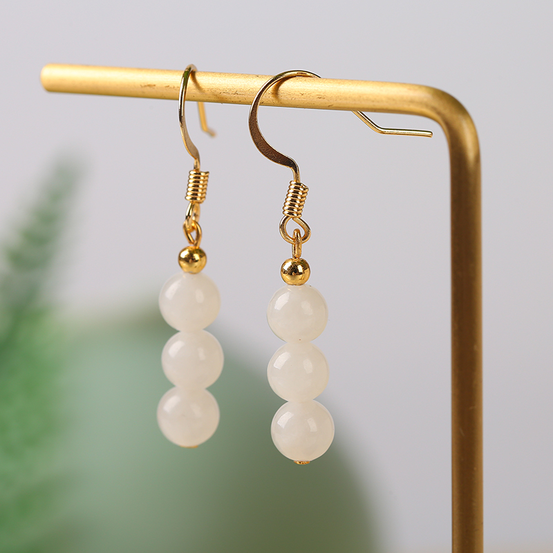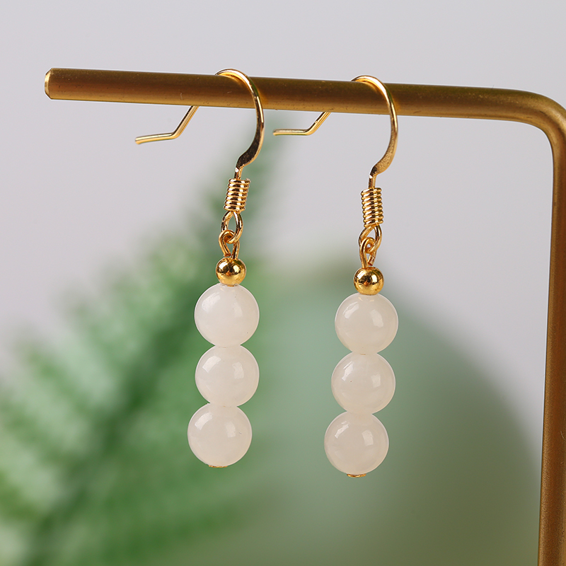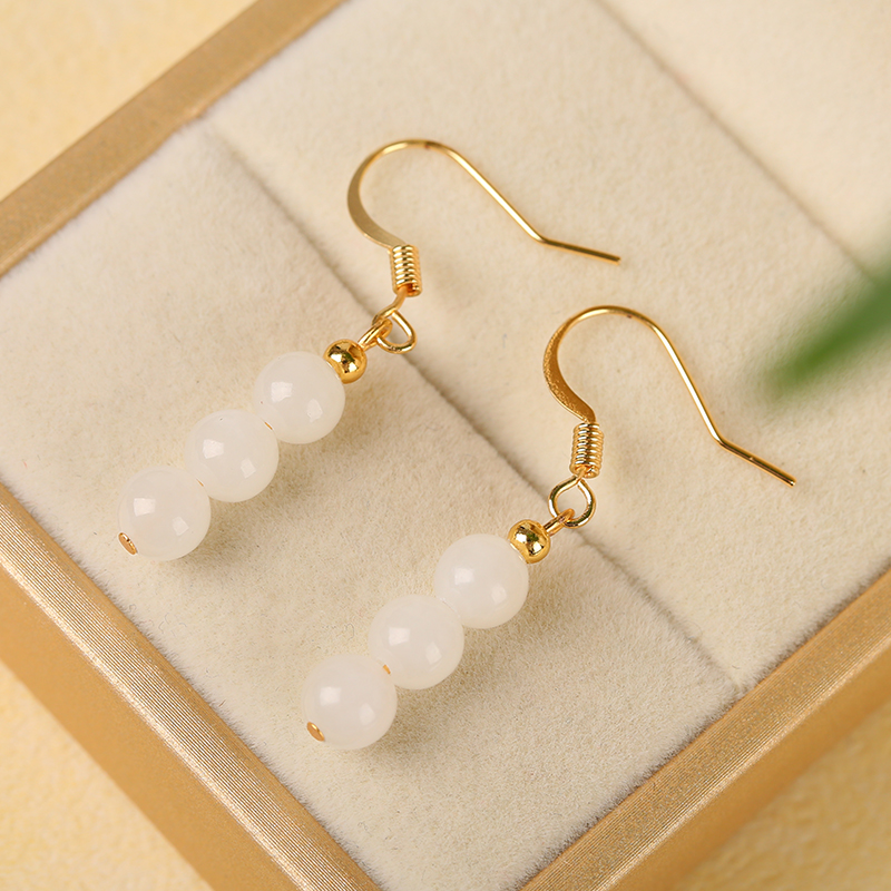 Natural Hetian jade white jade earrings 6mm round beads ear hook earrings earrings earrings 14K gold inlaid earrings DIY jewelry
