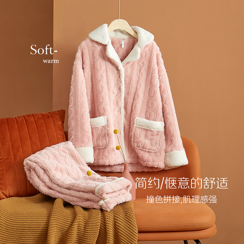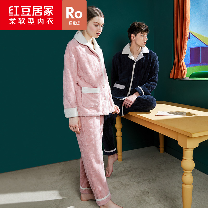 Red bean women's autumn and winter coral fleece pajamas large size loose casual couple suits thickened flannel men's homewear