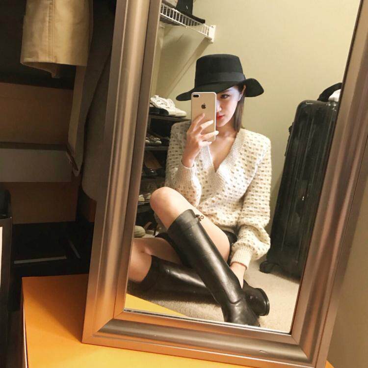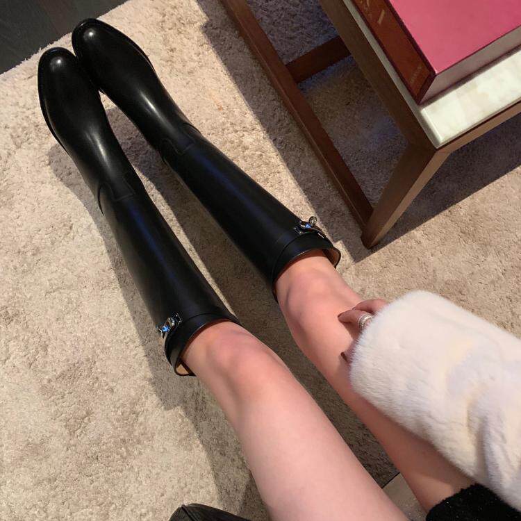 ins high end version giant beauty self-leaving @ black genuine leather flat bottom and knee knight long boots though knee-high cylinder boots woman