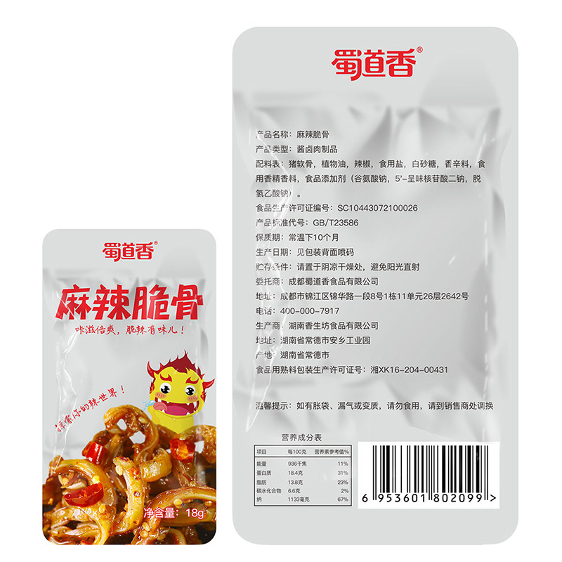 Shu Daoxiang Spicy Crisp Bones 18g Sichuan Chengdu Teatable Spicy Strips of Pork Cartilage Snack After the Drone Zero Food Food
