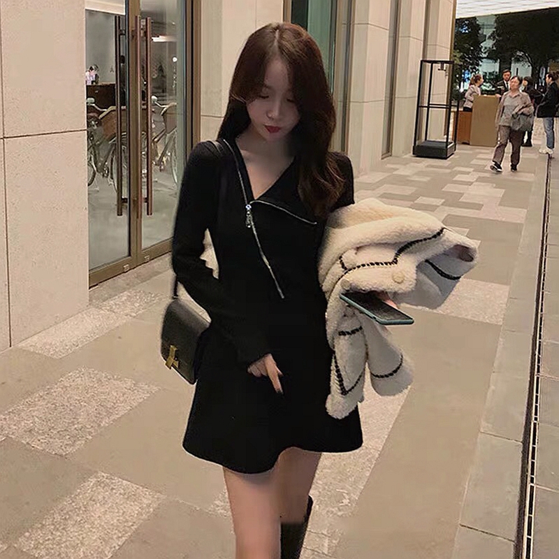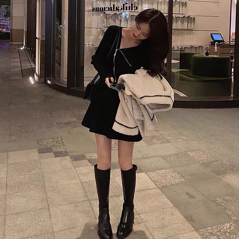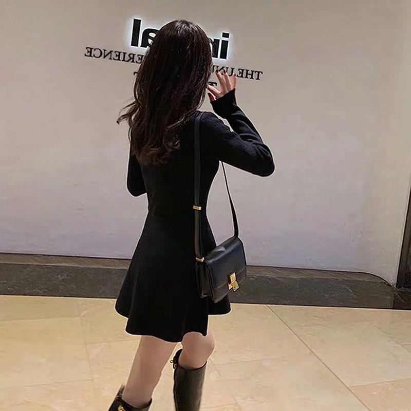 French retro first love Heben wind black skirt design temperament in the long sleeve bottom dress autumn winter