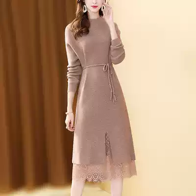 Knitted dress women autumn and winter new foreign pie long version loose waist lace stitching base sweater skirt
