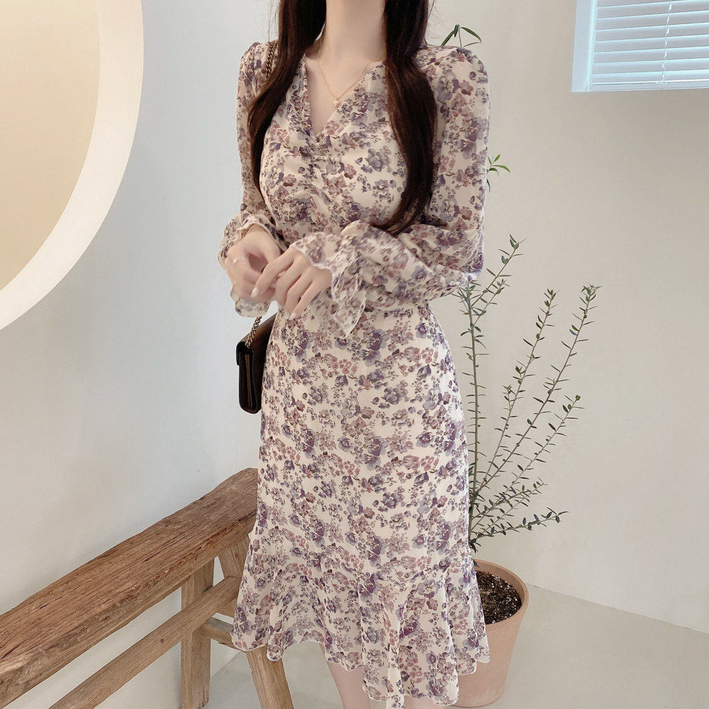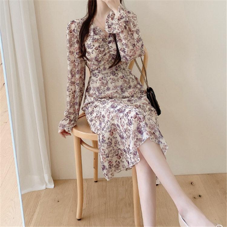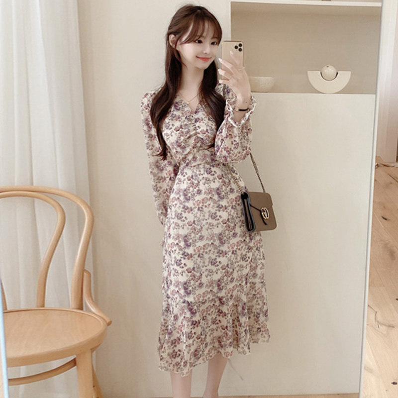Europe station 2020 Fall new temperament V Coldfolded flowers Nelong version of the women in the middle of a long version of the cashew slim fit nepotism