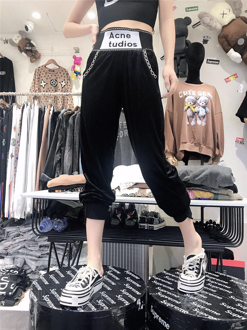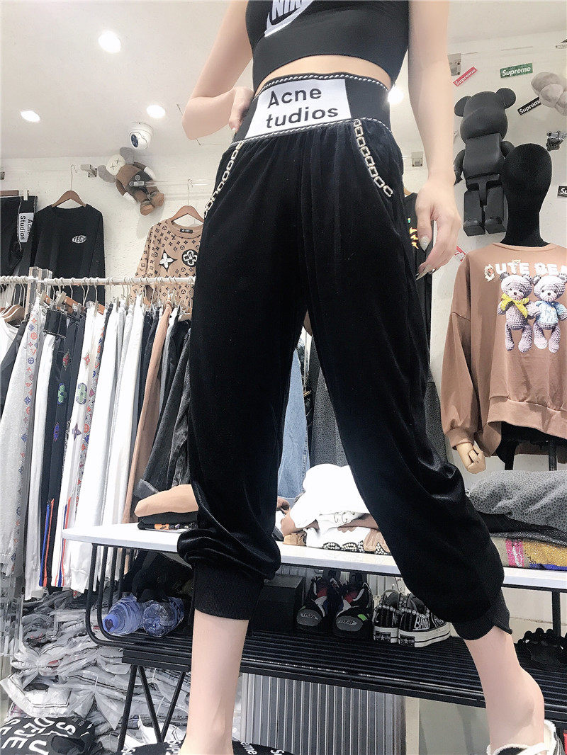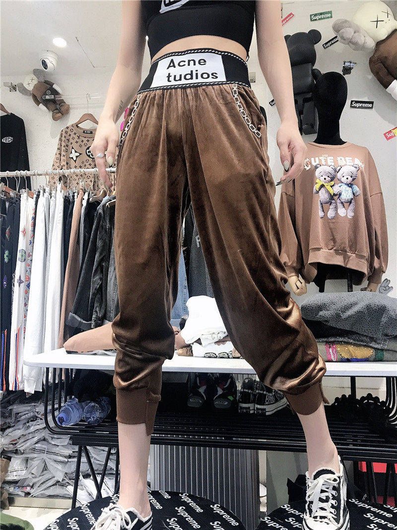 European station 2020 autumn and winter new net red letters high waist corset pants women's loose all-match gold velvet harem pants trend