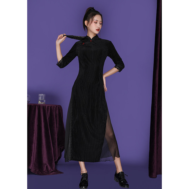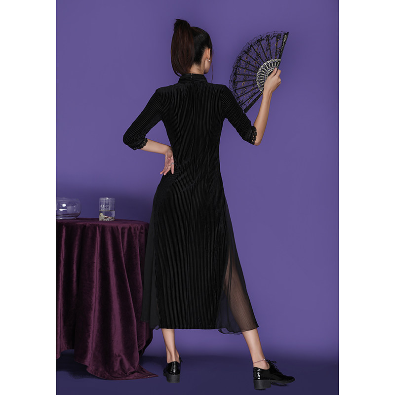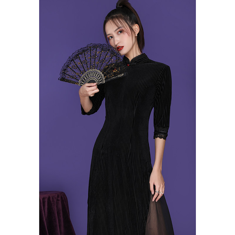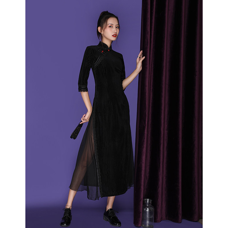 Autumn long-sleeved improved cheongsam girly temperament Chinese style young style slim black corduroy dress long section