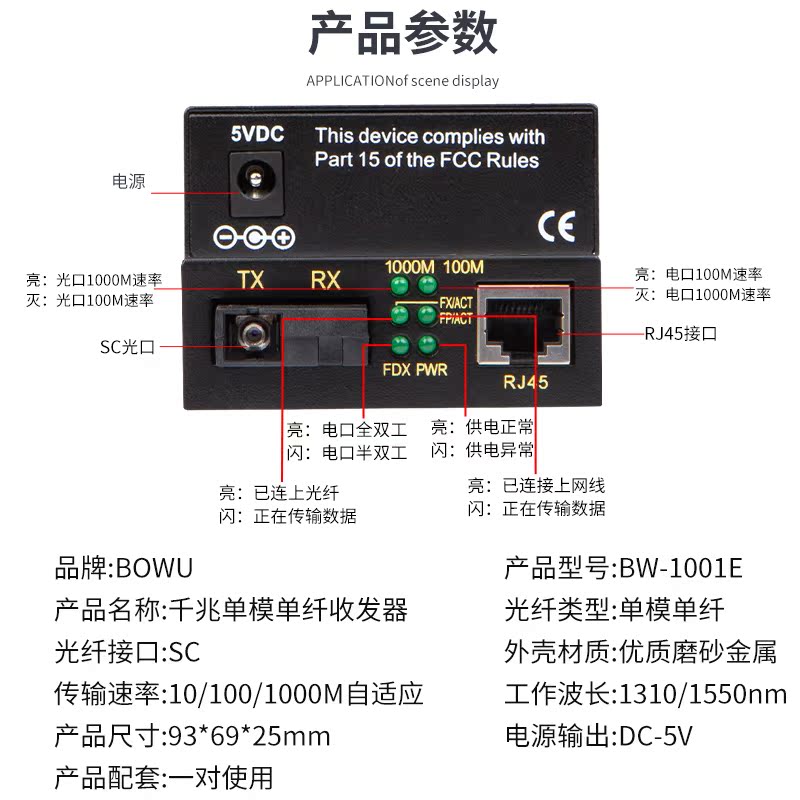 BOWU gigabit fiber Optic transceiver A pair of single-mode single-fiber 5v2a external power supply Optical fiber transceiver SC photoelectric converter Network video surveillance long-distance two-way Ethernet transmission 3km