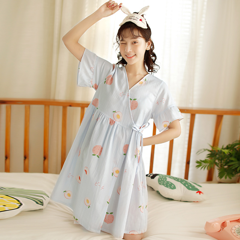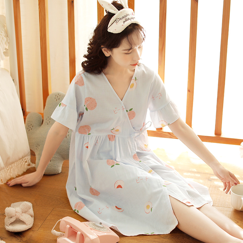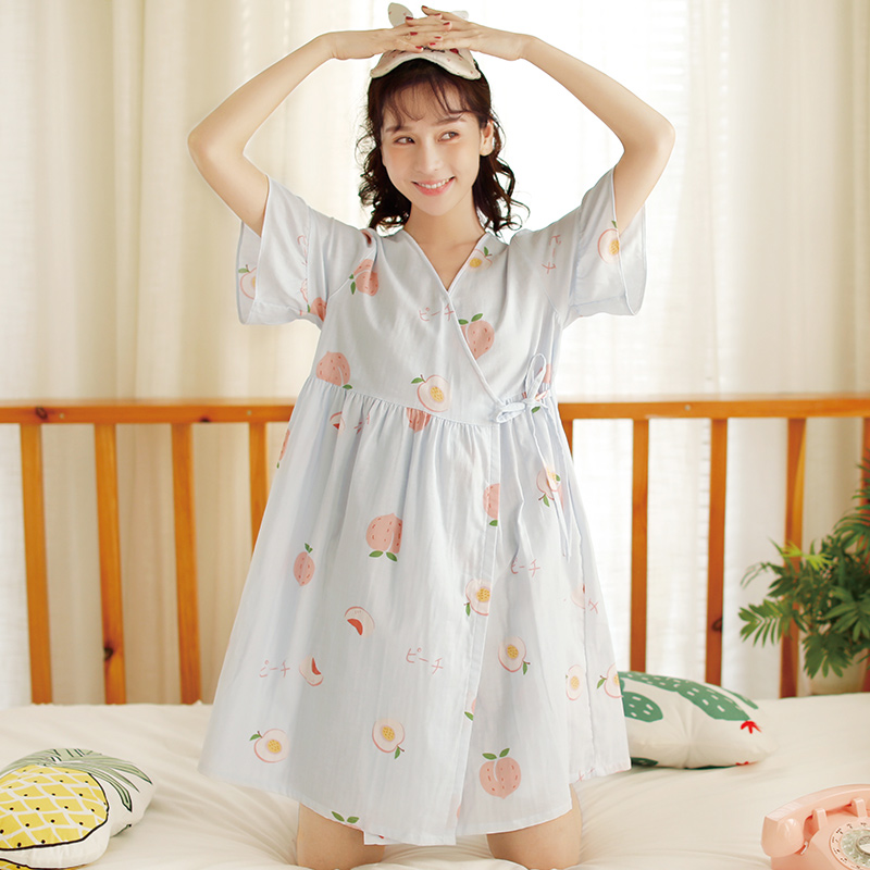 Long version of summer pyjamas in Japanese style and sleeping dress laces for women in summer thin water honey peach full cotton and wind home dress