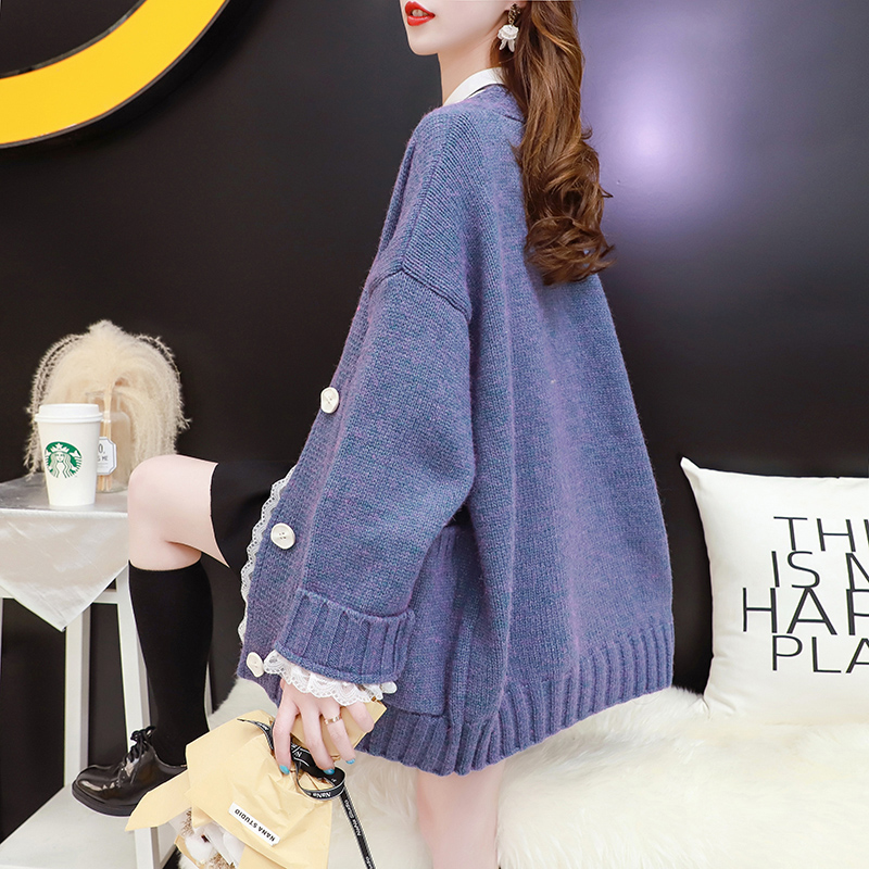 Spring-autumn knit cardiovert female lace splicing sweater jacket 2021 new early fall loose and very fairy wearing a blouse