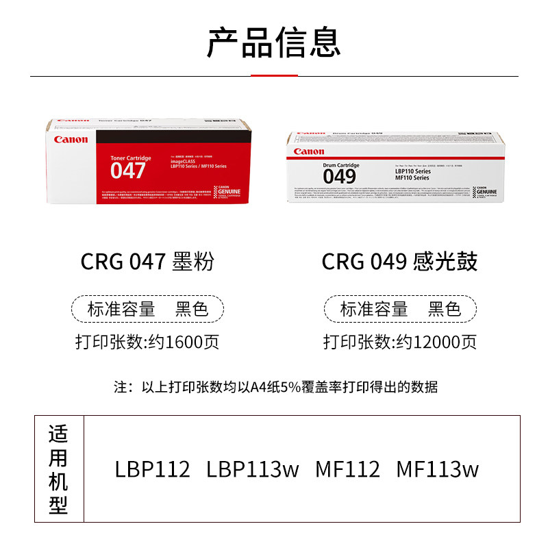 CRG-047 toner cartridge-approx. 1600 pages (5% coverage on A4 paper) CRG-049 photosensitive drum (without toner) will be delivered upon ordering 1 Canon environmental protection bag