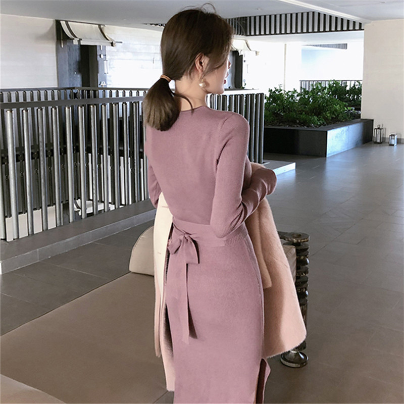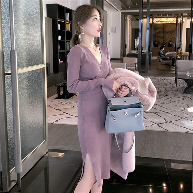 Sexy V Collar Long Sleeve Bag Arm Open Fork Skirt Woman Autumn Winter 2022 New Inner Hitch Knitwear Purple Ocean Dress