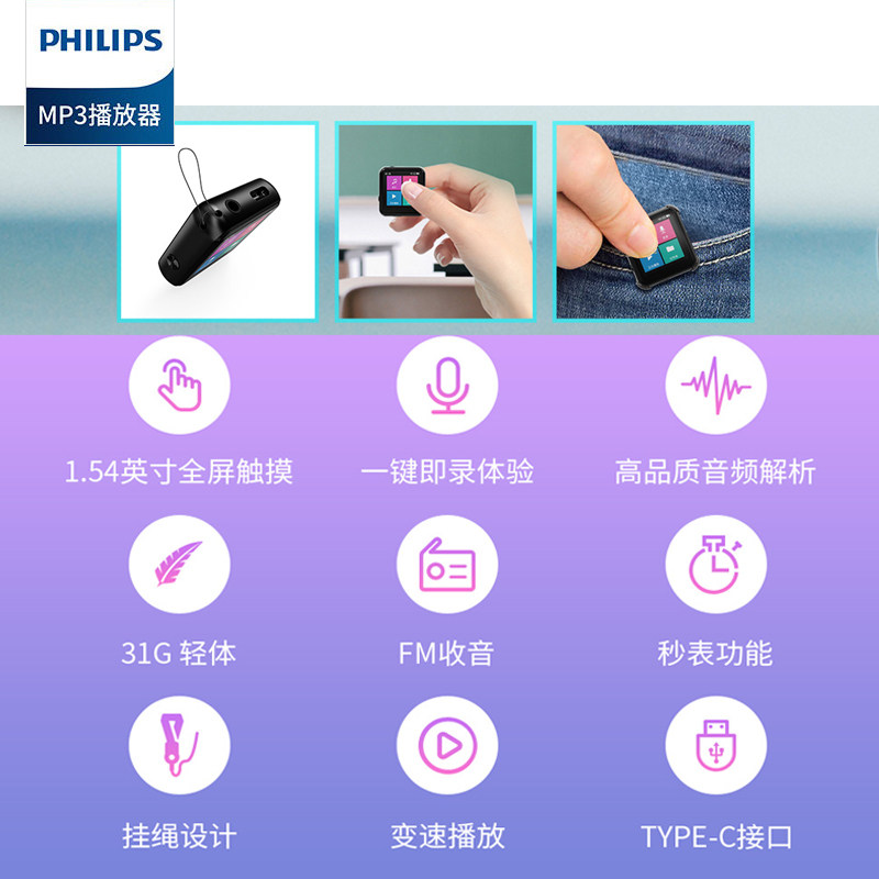 Philips SA2301mp3 with body listening to student version small listen song girl boy cute English hearing mp4 touch screen ultra-thin small portable sport p3 Mini undistorted music player