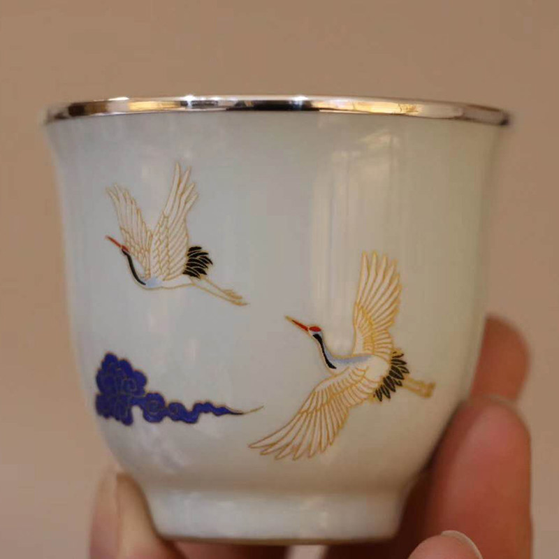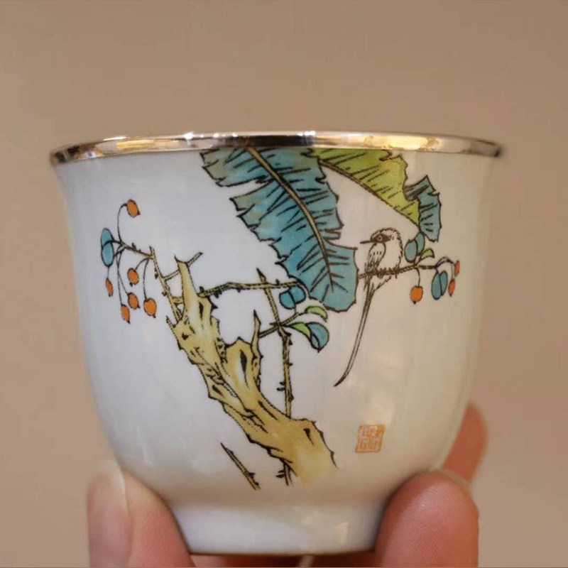 Easy Silver Ware Pure Silver Tea Cup Flat Walking Green Delight Upper Branch Hand-painted Porcelain Bag Silver Cup Suit Kutian Tea Bowl