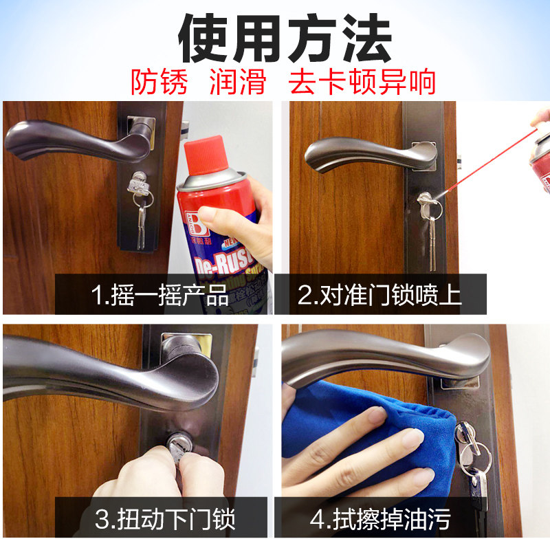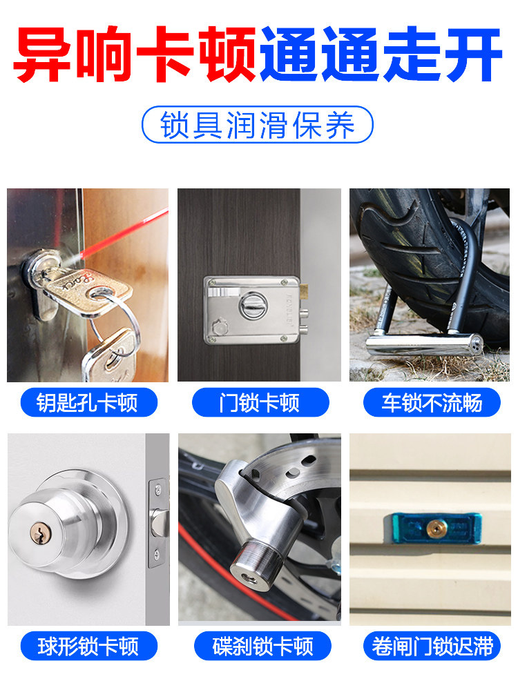 1 piece of door and window lock lubrication (new upgrade, no smell) 1 piece of 100ml anti-rust lubricant (anti-rust lubrication, unlocking is more silky) 1 piece of 100ml loosening agent (lubricating the lock cylinder