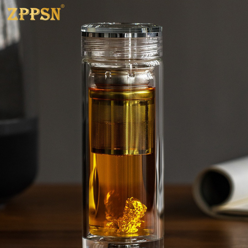 ZPPSN light luxury S999 sterling silver tea water separation tea cup Double glass men's and women's high-end business crystal cup
