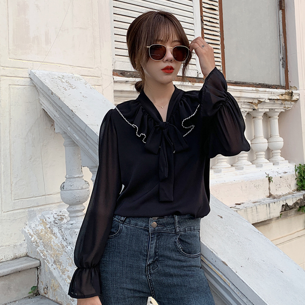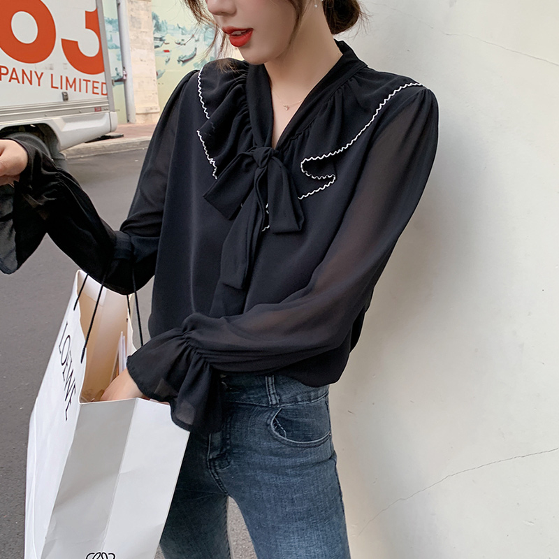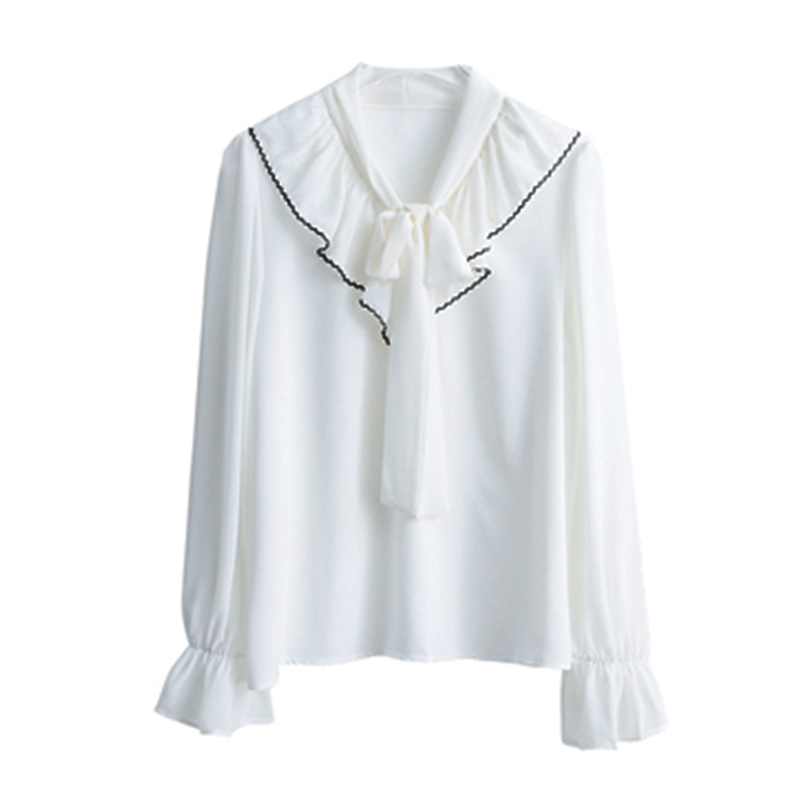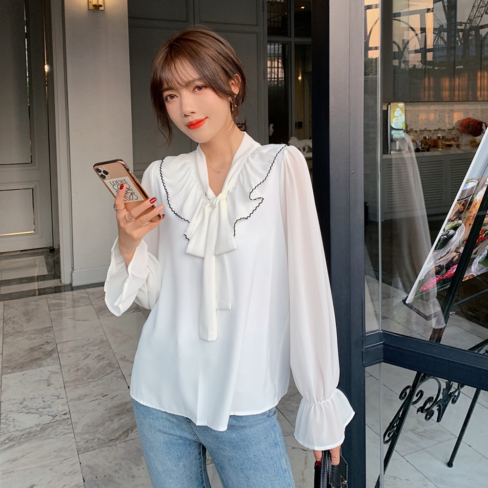 New autumn snow spinning long sleeve shirt V-collar butterfly tied with pie thin, loose leaf sleeve white coat