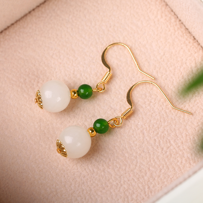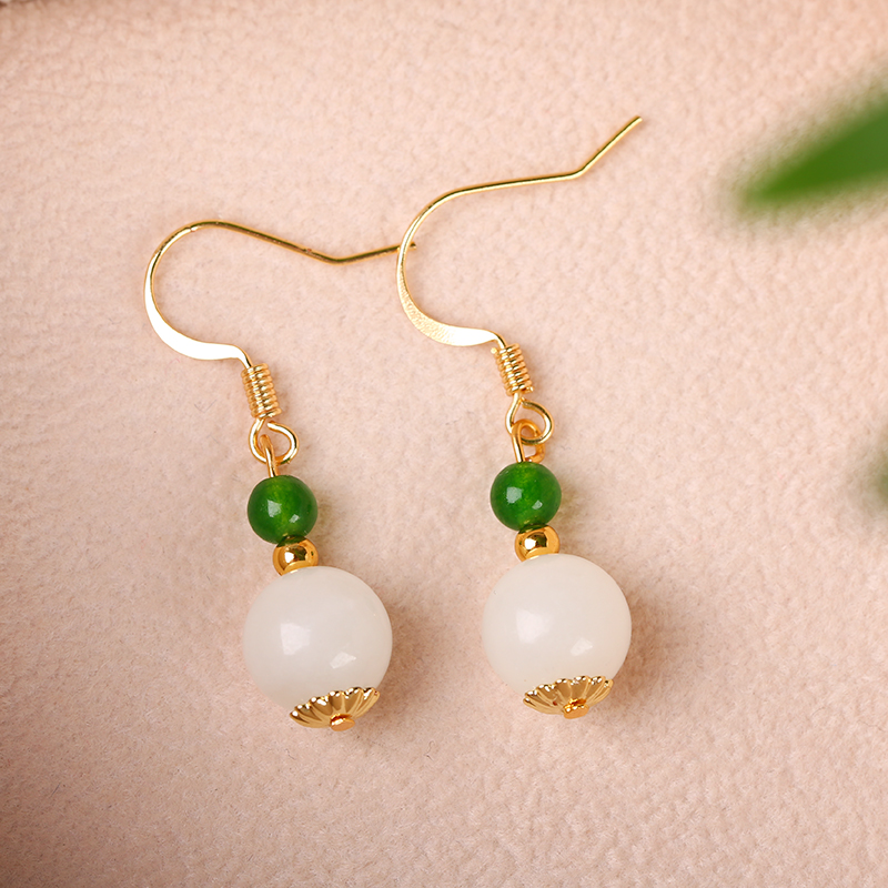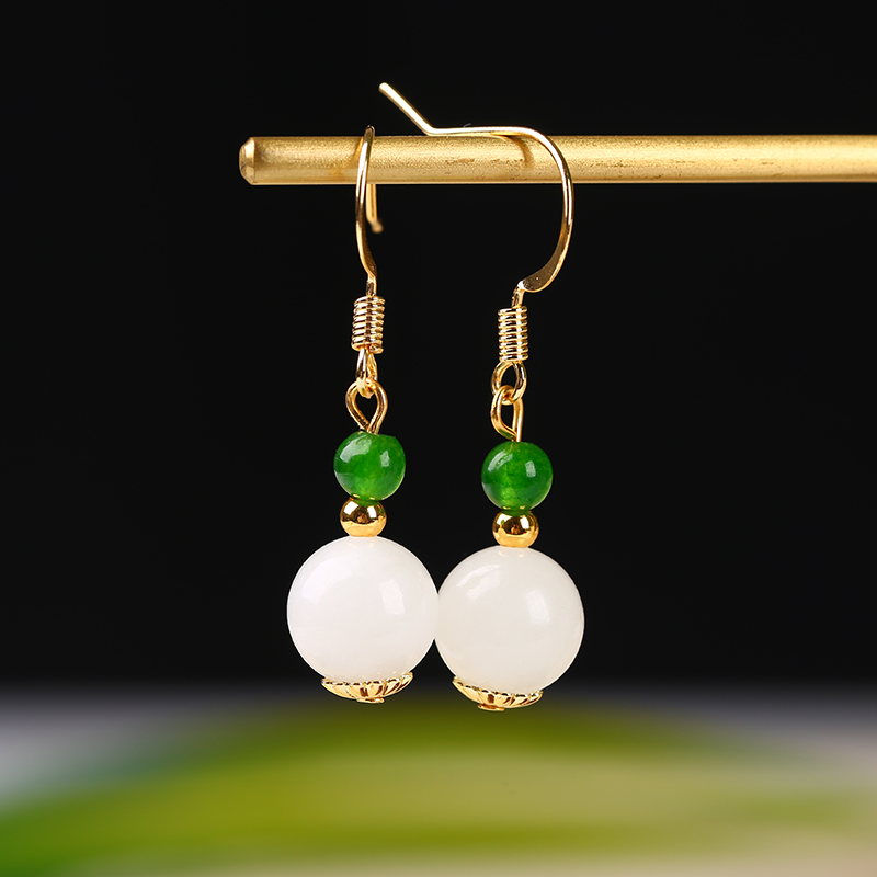 Natural Hetian jade white jade ear hook earrings earrings 10mm white jade + 4mm chrysoprase beads 14k gold earrings
