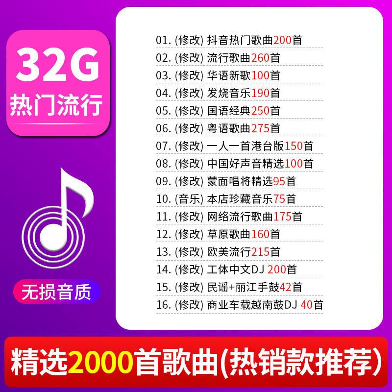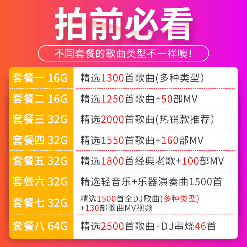 (16G) Popular Pop 1300 (16G) Hot Pop 1250 Songs + 50 MV (32G) Popular Pop 2000 Songs (32G) Hot Pop 1550 Songs + 160 MV (32G) Classic Old Songs 1800 + 100 MV (32G) 1500 Light Music Instrumental Music (32G) Hot DJ 1500 + 130 MV (64G) Large Capacity 2500 + DJ Skewer 46
