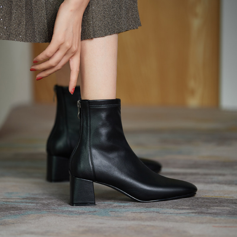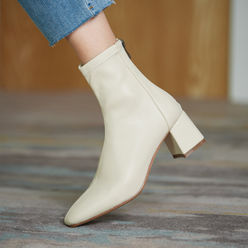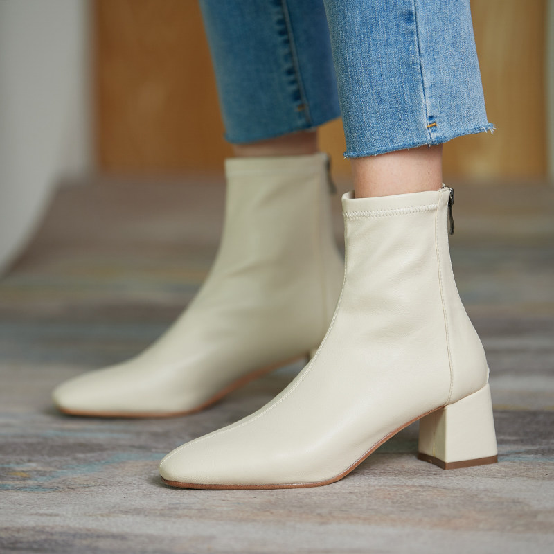 ins self-leaving giant look ~ Korean rice white rear pull chain coarse heel short boots high heel elastic boots slim boots