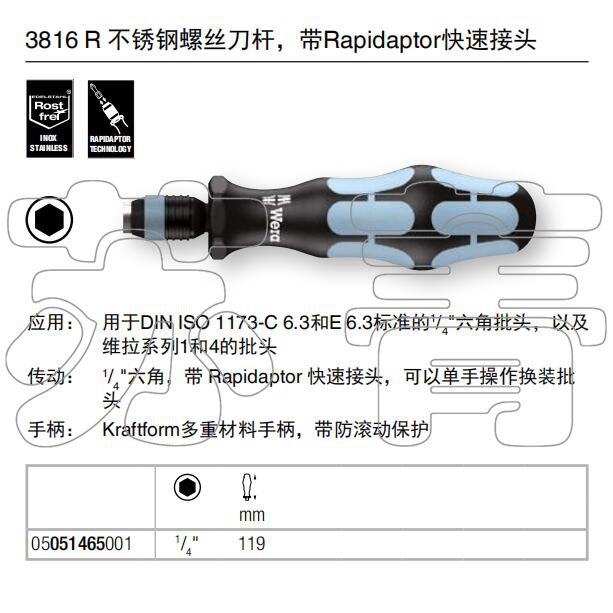 German Wera Villa 3816 R stainless steel screwdriver quick handle fits 1 4 batches