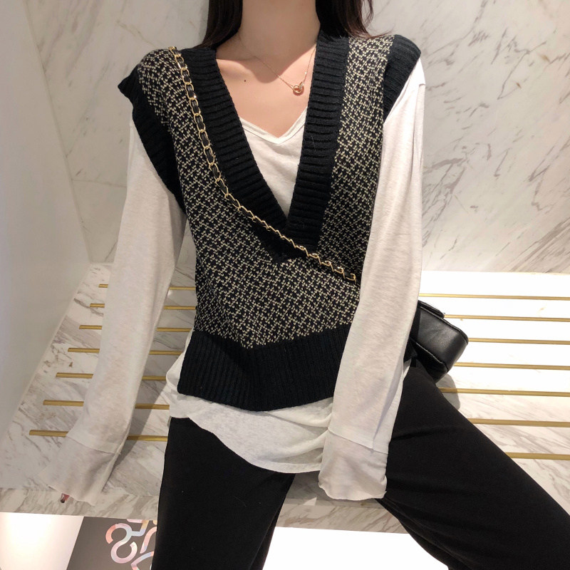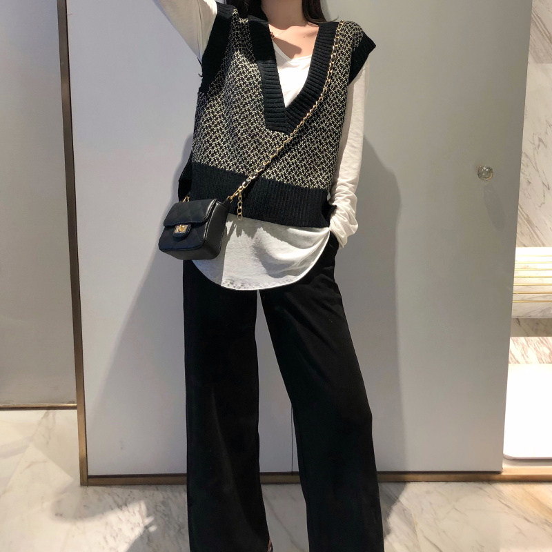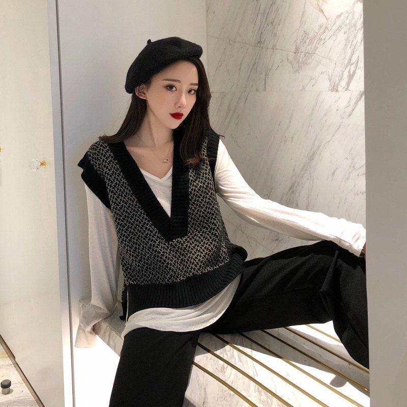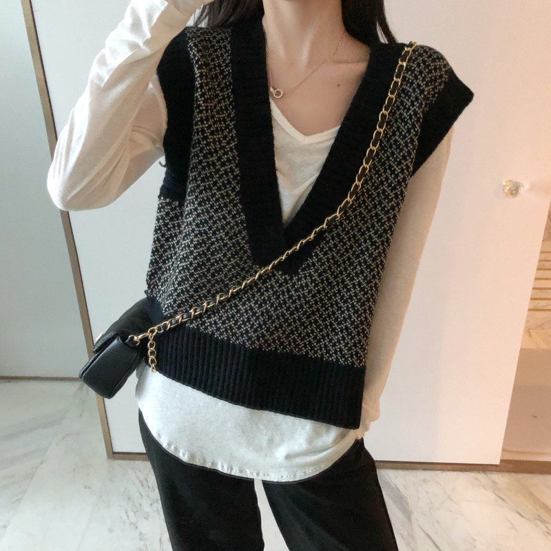 Knit waistcoat Women's autumn Winter Korean retro temperament Lazy Kan shoulder plaid outside wearing sleeveless vest sweater