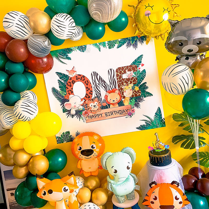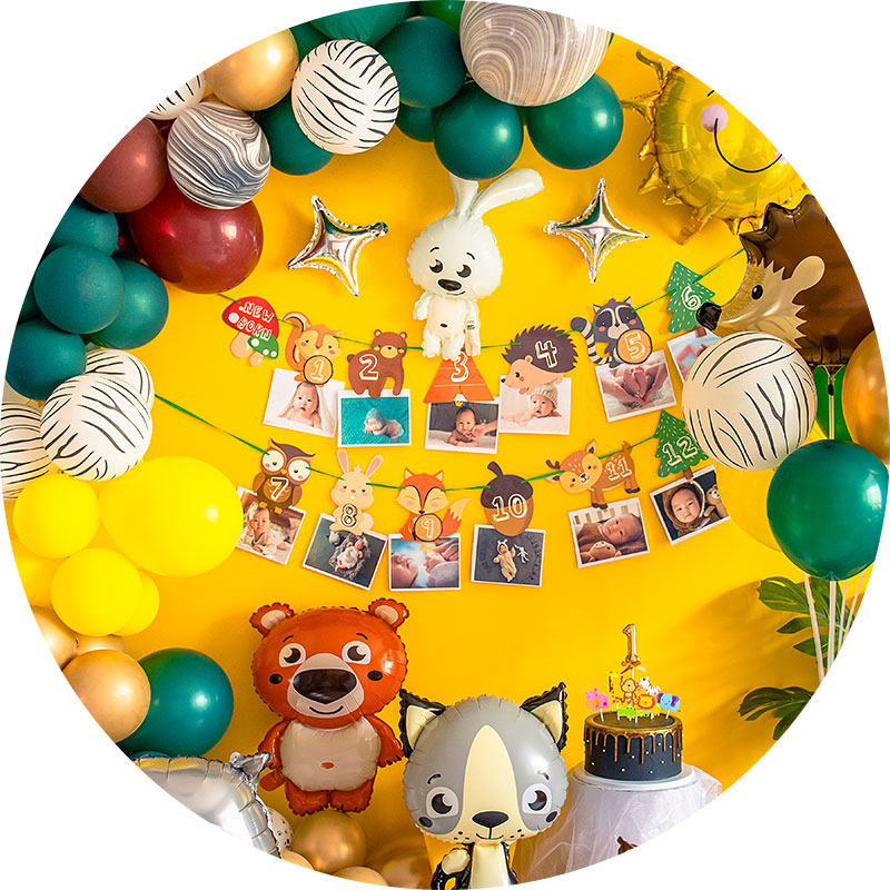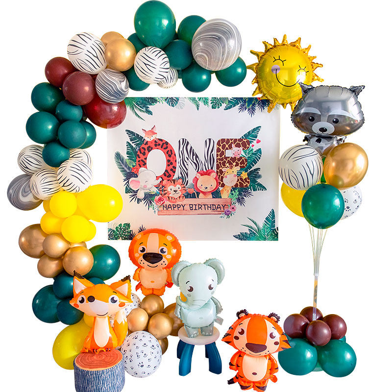 Small animal balloon decorating baby 1st birthday forest series party arrangement poster background wall