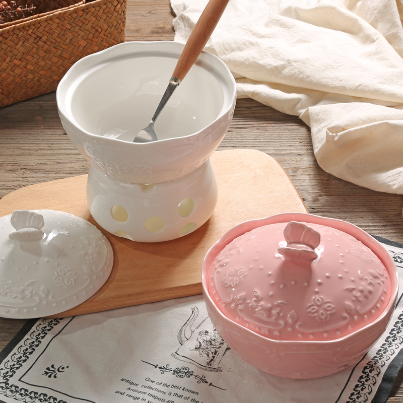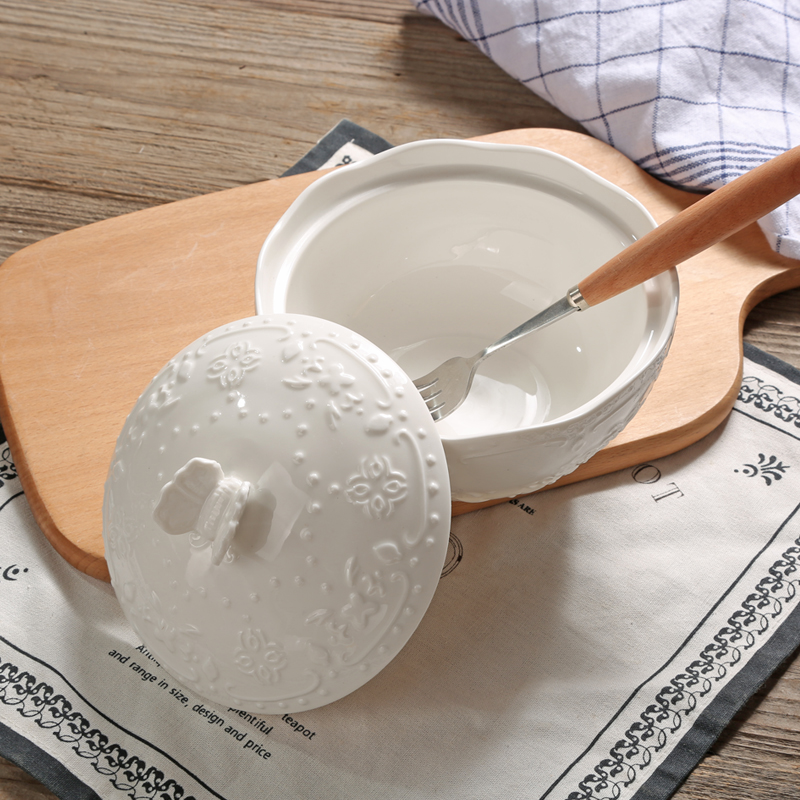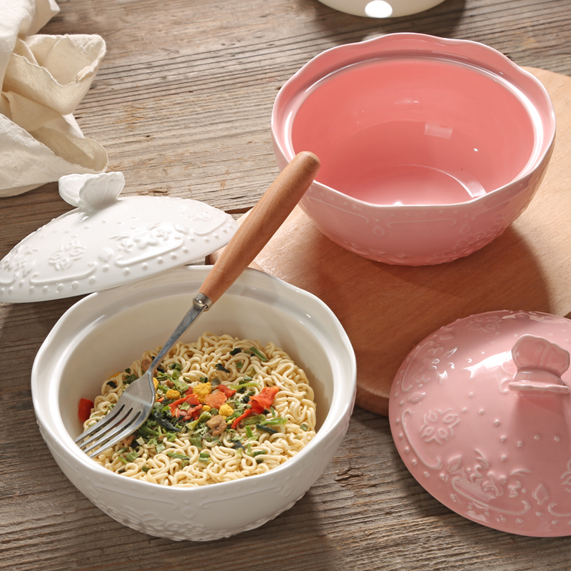With lid butterfly flower relief instant noodle bowl lace cute household ceramic soup bowl fruit salad drink porridge can be microwaved