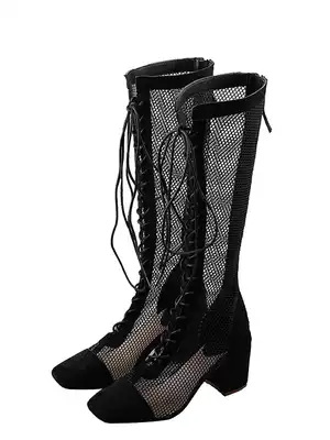 Boots Women's knees Spring summer boots khaki breathable hollow mesh red high heel mesh mesh gauze cool boots