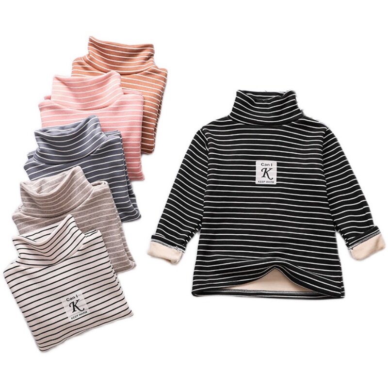 Boys velvet warm top Children's autumn and winter thickened girls one-piece velvet baby semi-high collar striped T-shirt long sleeve
