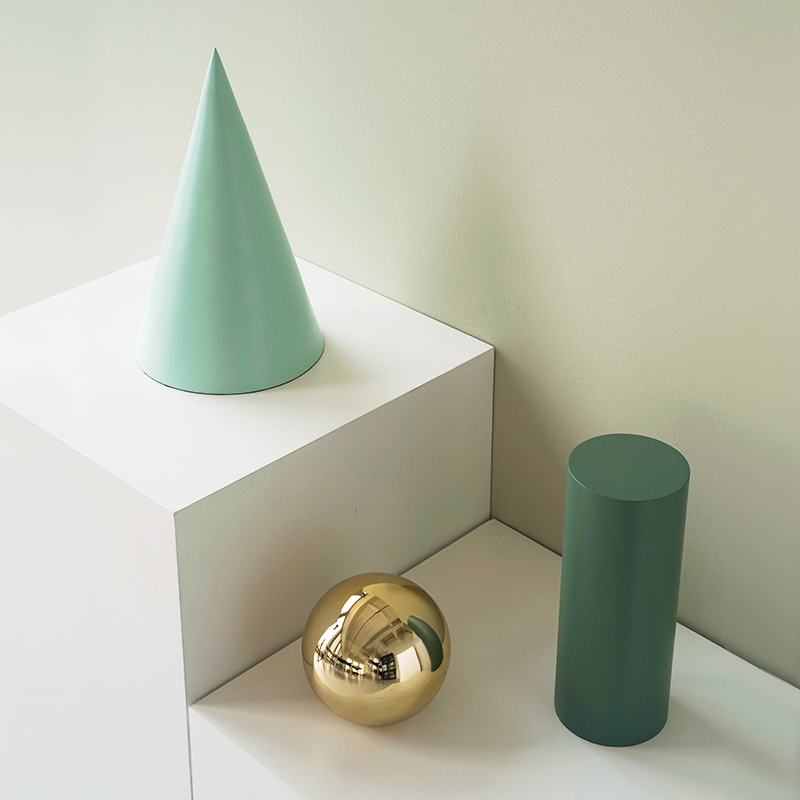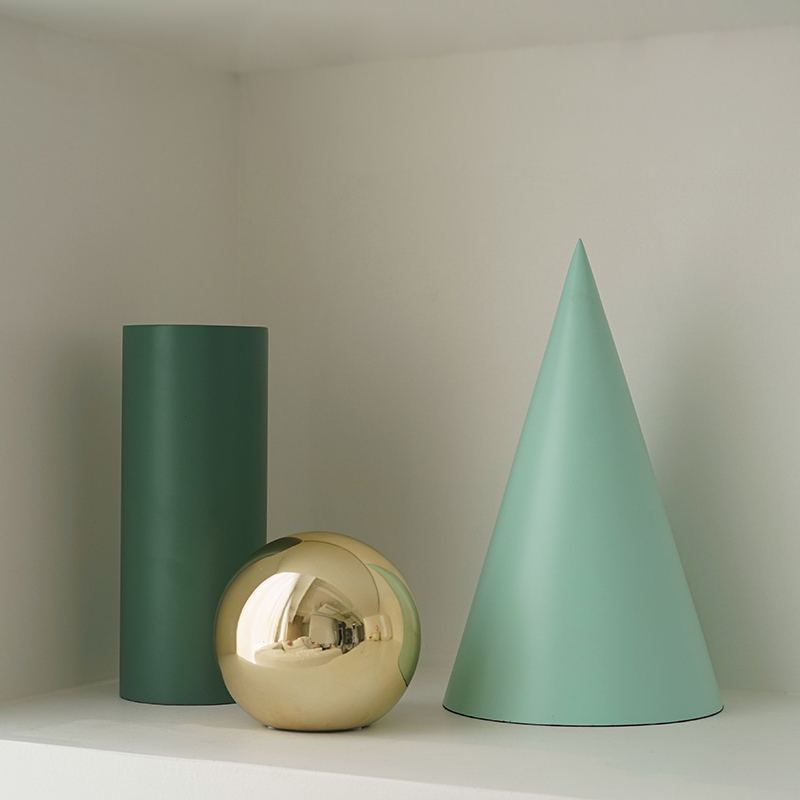 Cylinder (solid wood spray paint) Cone (solid wood spray paint) Gold sphere (ceramic) Note