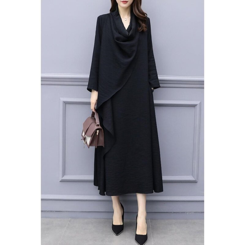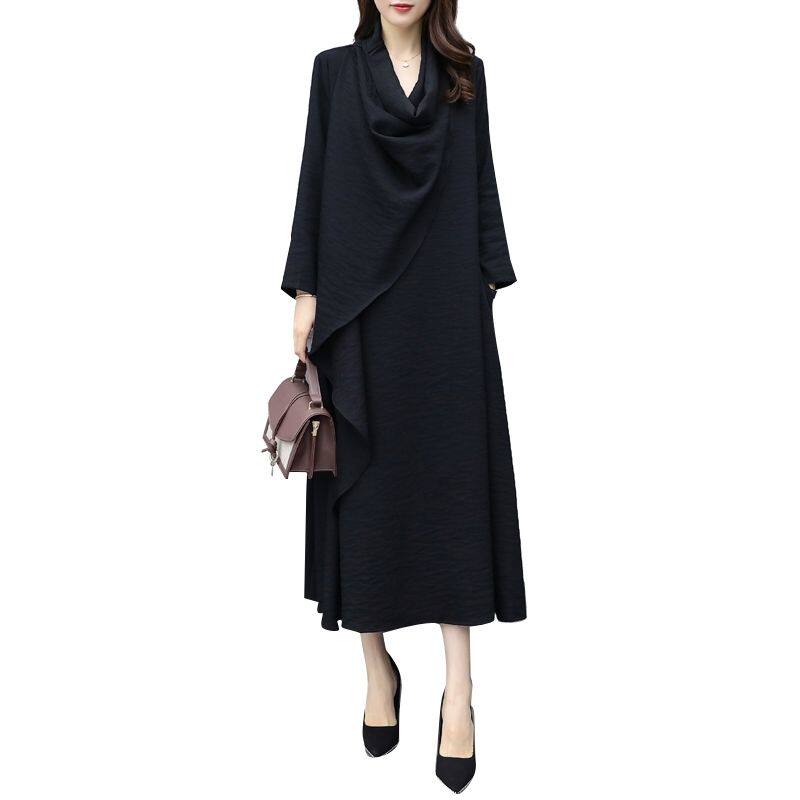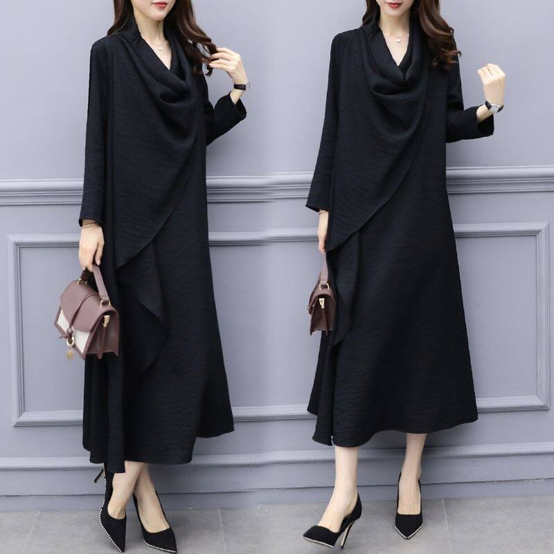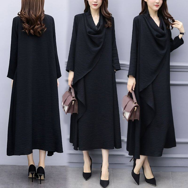 2020 Fall Women's Dress Loot Big Code Long Dress Code Long Dress Woman Black Display Slim Long Sleeve Dress Pile Collar Long Skirt
