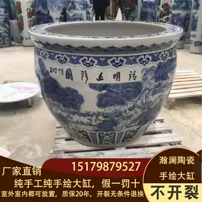Jingdezhen ceramic large cylinder 1 2 meters 1 meter 5 large courtyard decoration hand-painted Qingming Shanghe map blue and white large cylinder