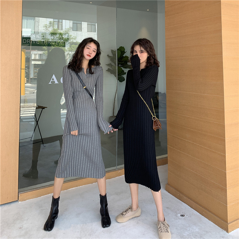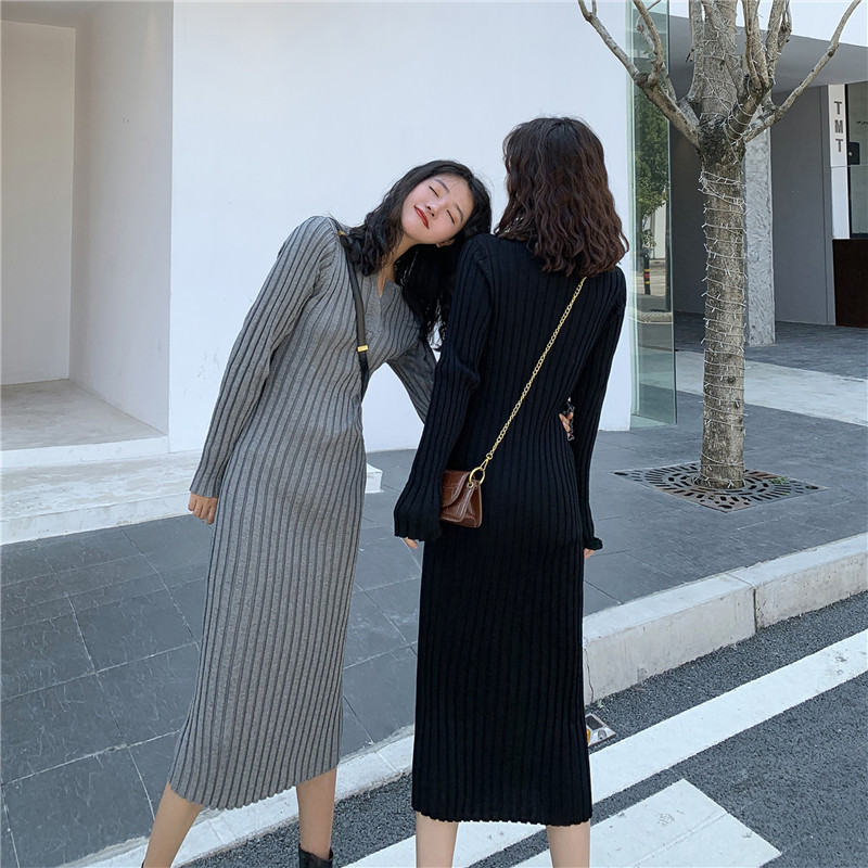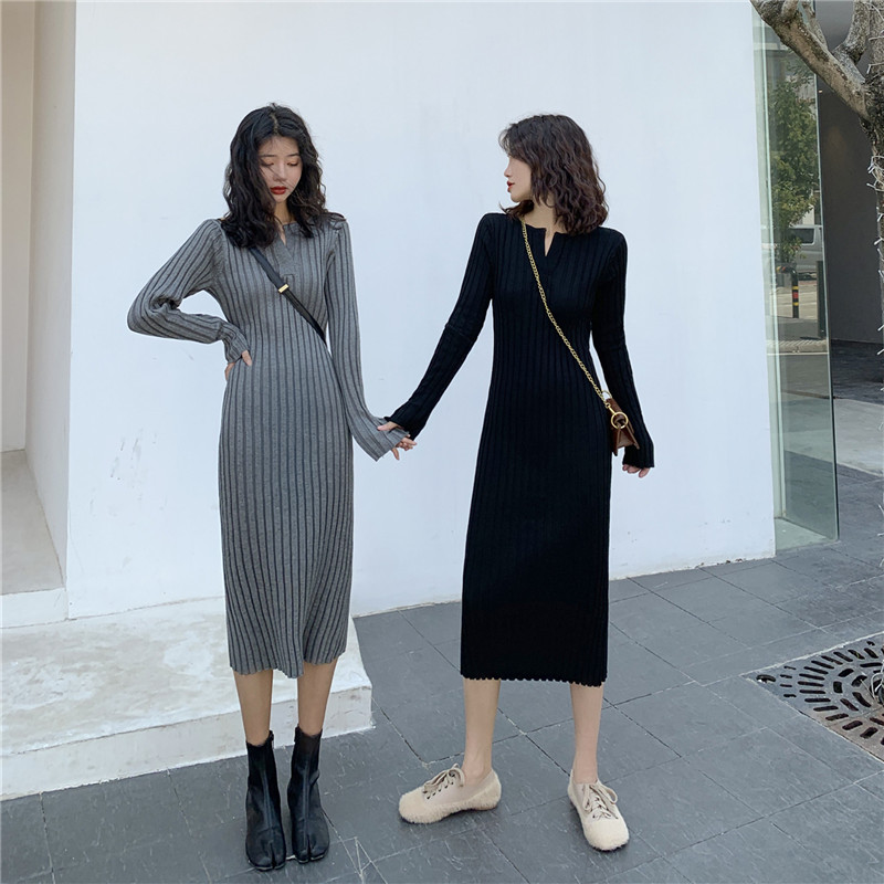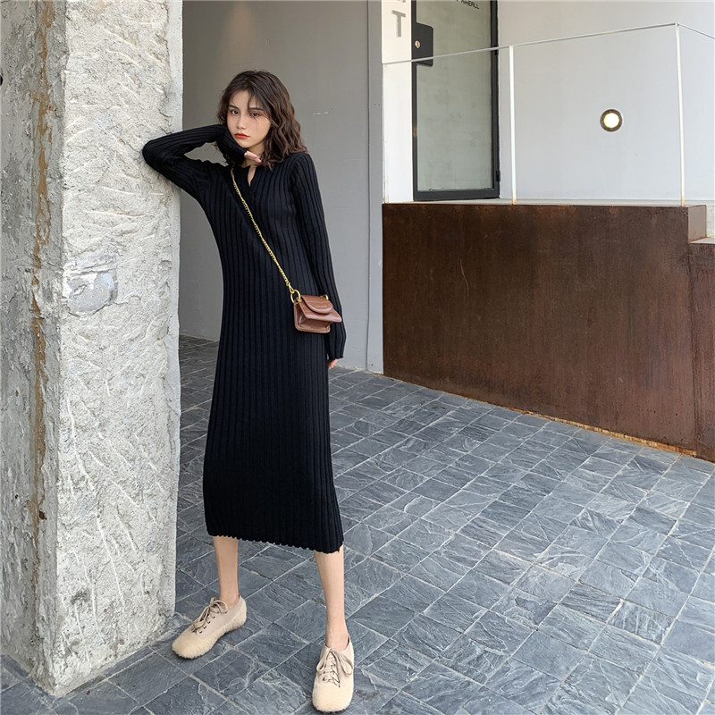 2020 Early autumn winter new swarm V collar mid-pack hip knit foreign dress with lap sweater skirt dresses