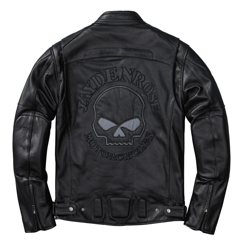New Harley leather jacket men's leather short vertical collar top layer cowhide embroidered motorcycle leather jacket fluorescent strip coat cool